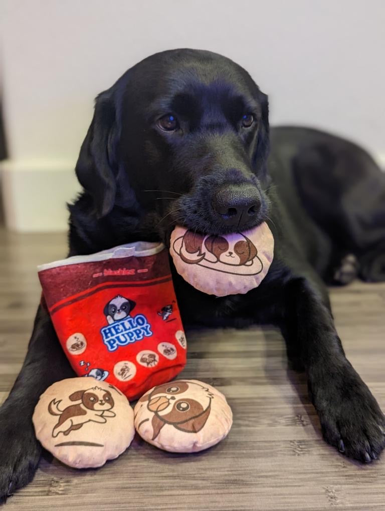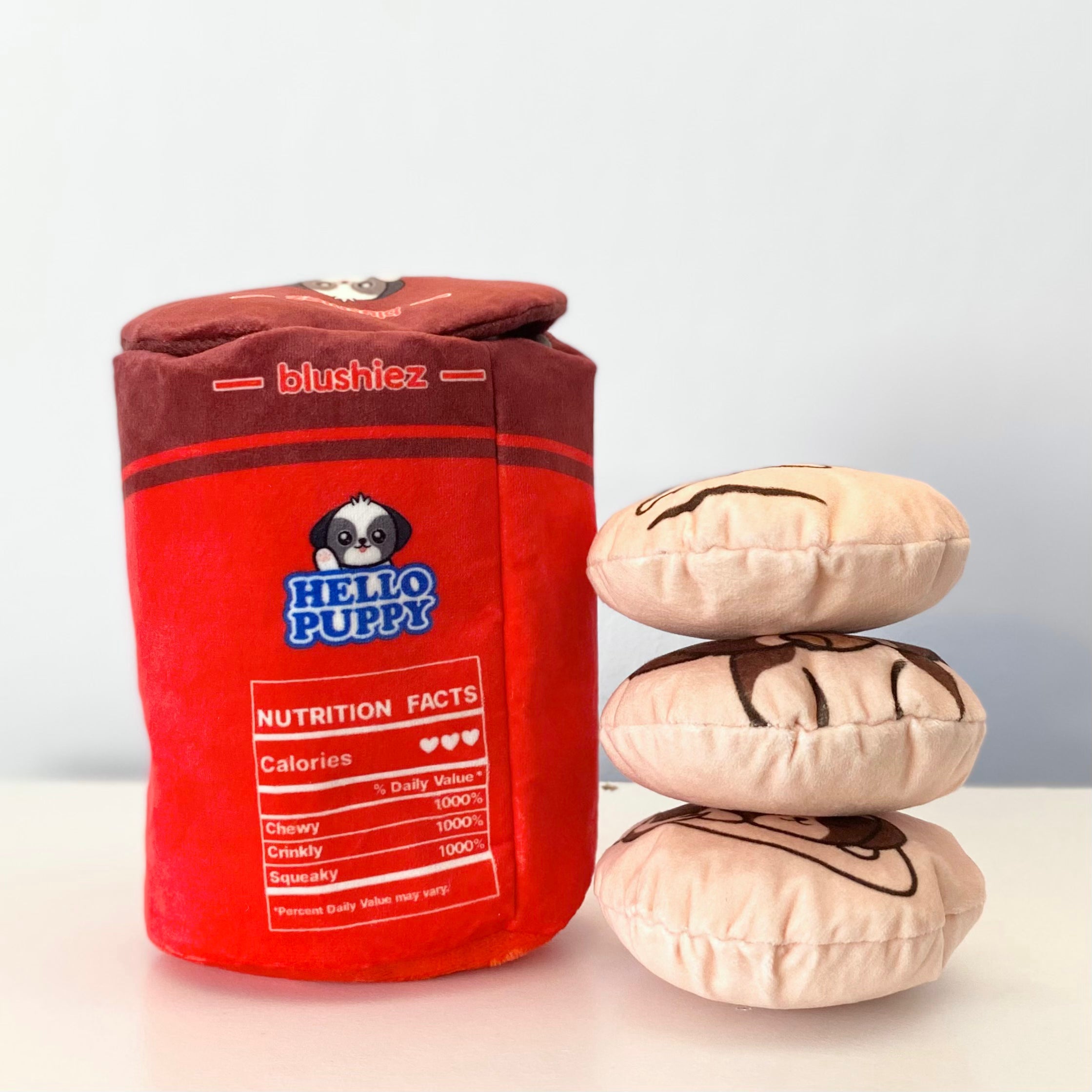 Your sweet fur babies deserve a sweet treat too! Pups and pawrents are obsessed with our super cute Hello Puppy 4 piece dog toy designed after my 10 year old family Shihtzu, Charlie (featured in pics). Made out of a soft velvet-like material, the box has a Velcro closure which holds three “biscuits” and you can also hide any treats in there too for extra fun. The “biscuits” crinkle, squeak and are great for playing fetch!
